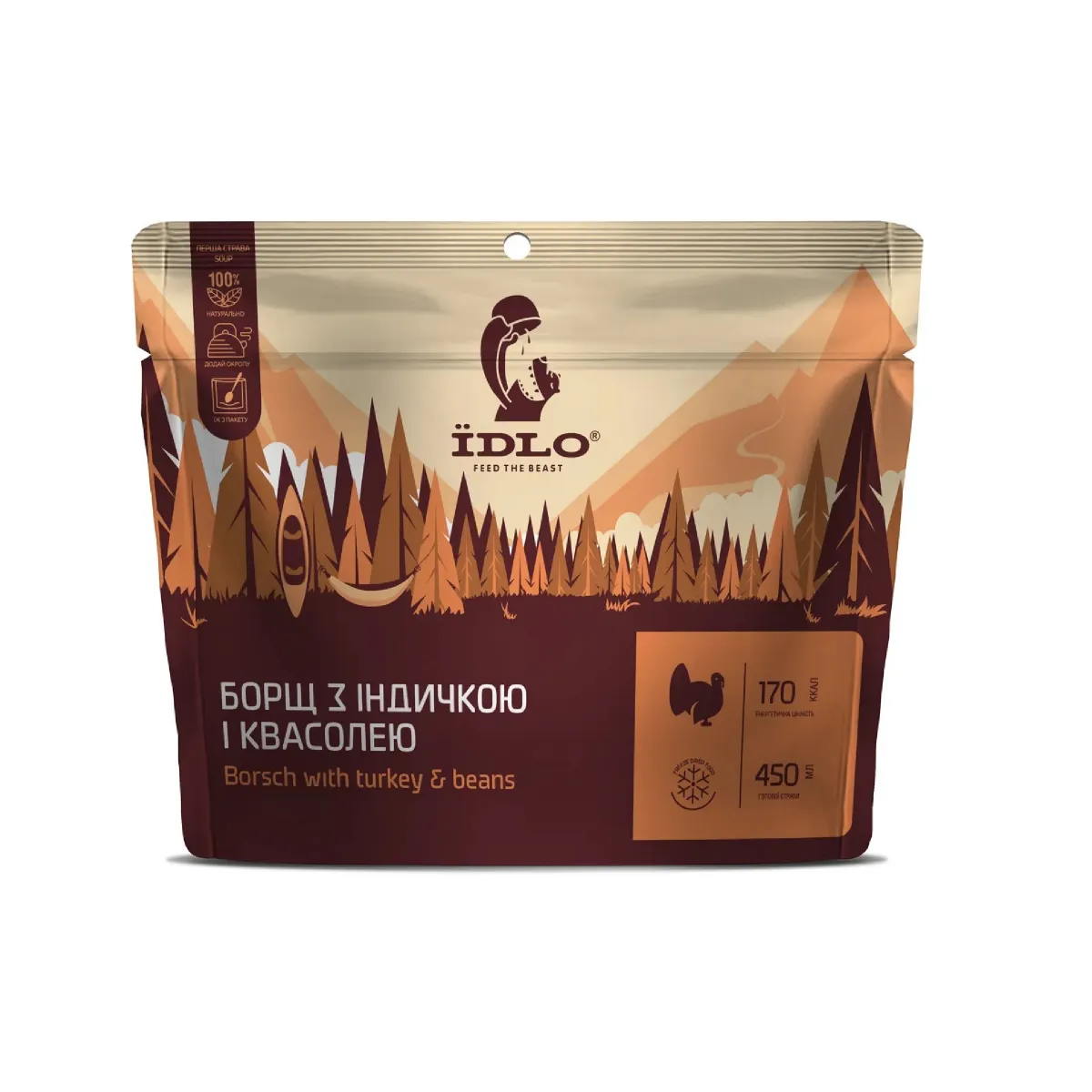 Натуральні сублімовані овочі, запашна петрушка, поживна індичка та квасоля для відчуття домашнього затишку, коли не можеш приготувати борщик в outdoor умовах.