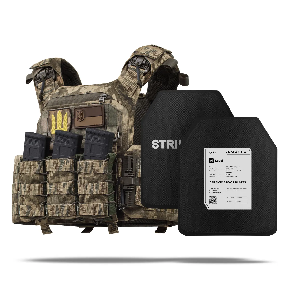 Найбільш міцний та надійний варіант бронежилета, який забезпечить вас найвищим у світі класом захисту (6 клас по ДСТУ або NIJ IV по світовій класифікації) при вазі всього 6.2 кг. В комплект входить: дві керамічні бронеплити 6-го класу захисту (вага кожної 2.8 кг) та плитоноска (PRO) покращена із системою швидкого скидання, супер м'якими підплічниками та матеріалу CORDURA 1000. Саме в такому комплекті броні виконують свої завдання спец підрозділи армії США, Франції, Британії та ін.