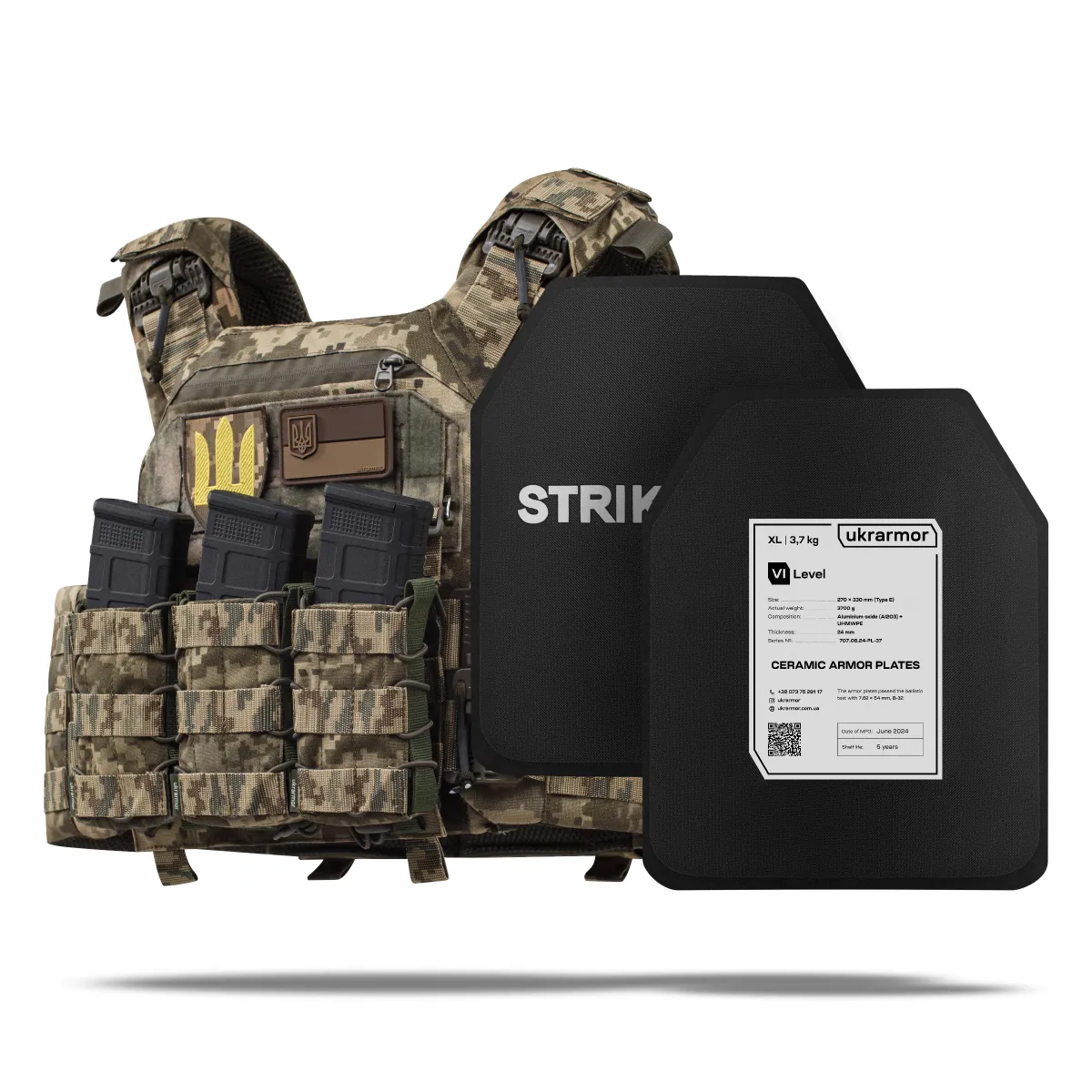 Найбільший та найнадійніший комплект захисту для здорованів, що складається з 2-х бронеплит XL 27 на 33 см, які в змозі витримати три влучання кулі Б-32 із снайперської гвинтівки СВД (це все з відстані 10 м згідно з стандартами ДСТУ 8782:2018.) та збільшеної плитоноски (PRO) покращеної, виготовленої з матеріалу CORDURA 1000, зі системою швидкого скидання і м'якими підплічниками (розрахована під бронеплити 27х33см та 27х35 см).