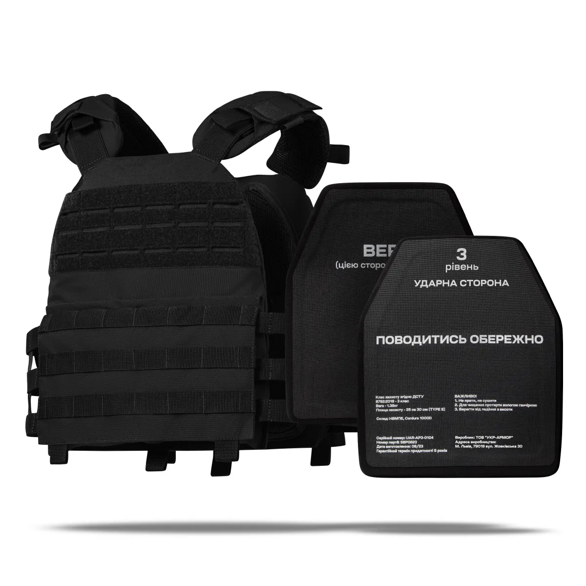 - Копию документа, удостоверяющего прохождение бронеплитами 6-го класса защиты по ДСТУ 8788:2018 (Выдержали по три попадания Б-32 (7.62 х 54 мм, СВД)