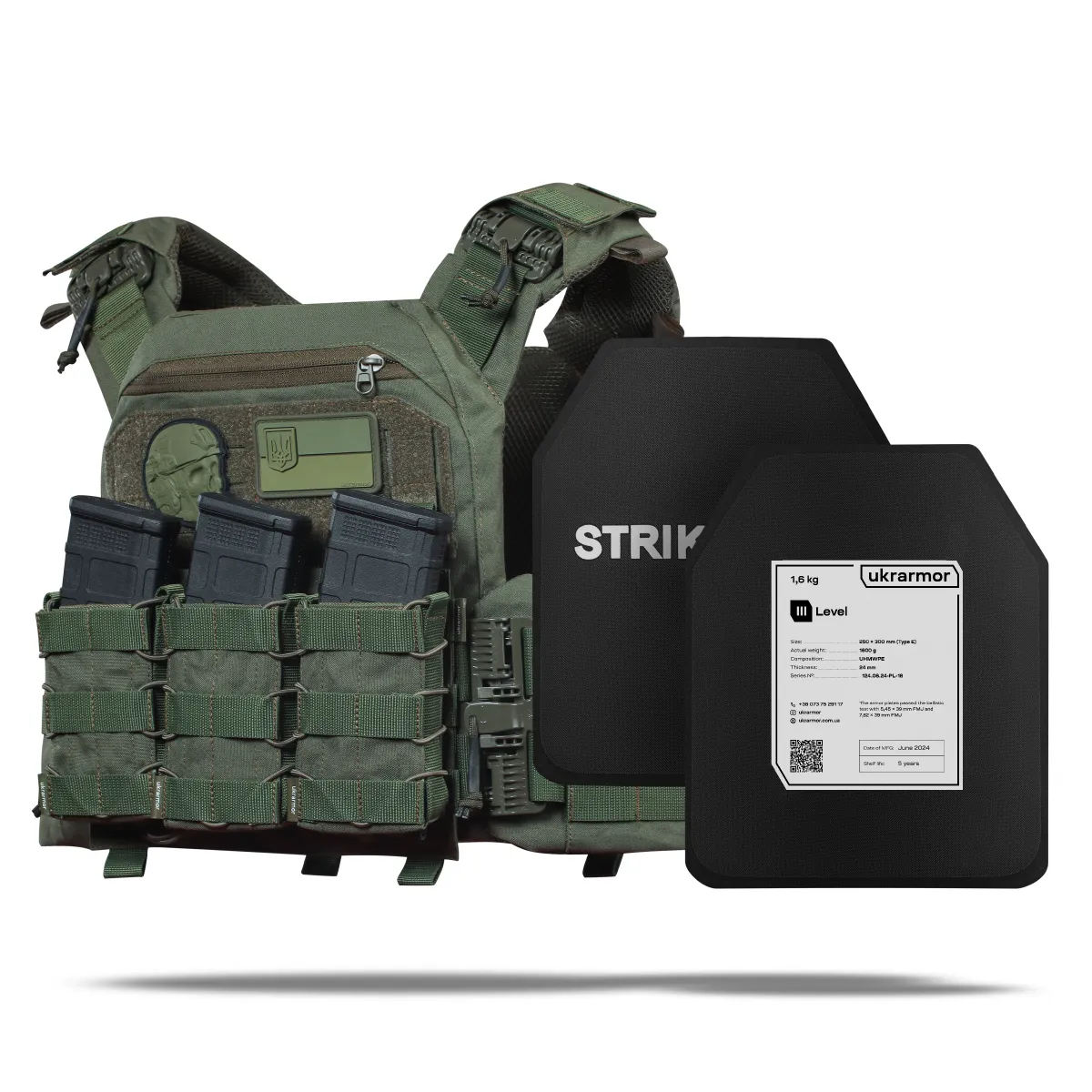 - Комплектация 2 бронеплиты 3 класса (вес 1.6 кг, НВМПЭ), плитоноска улучшенная (PRO).