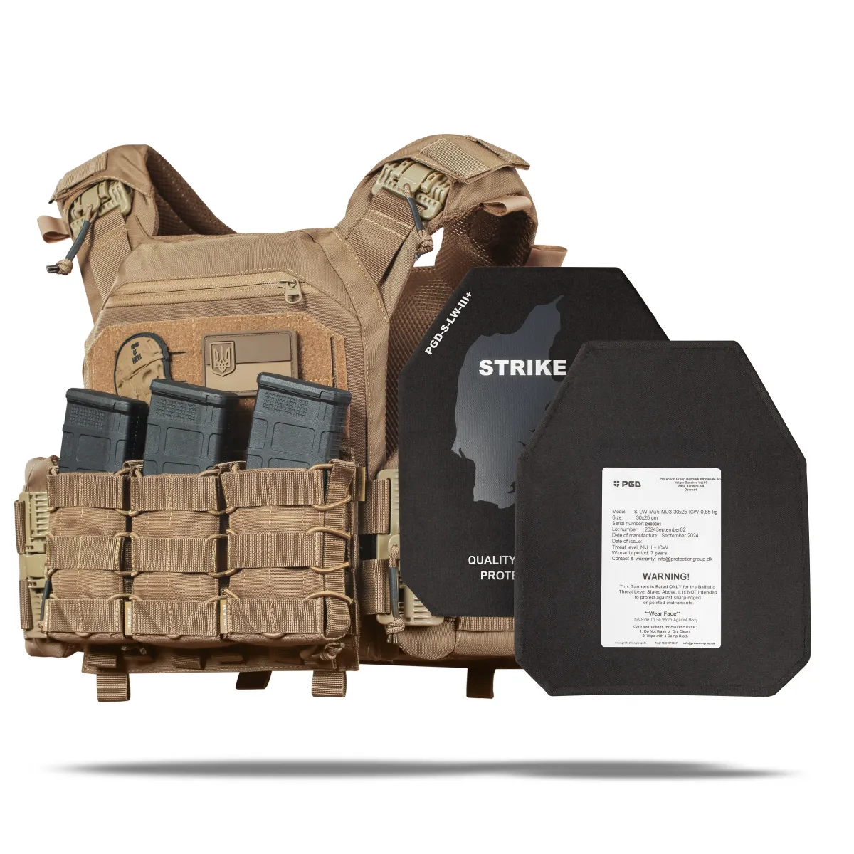 - Комплектация 2 бронеплиты (материал СВМПЭ), плитоноска улучшенная (PRO), копия протокола отстрела