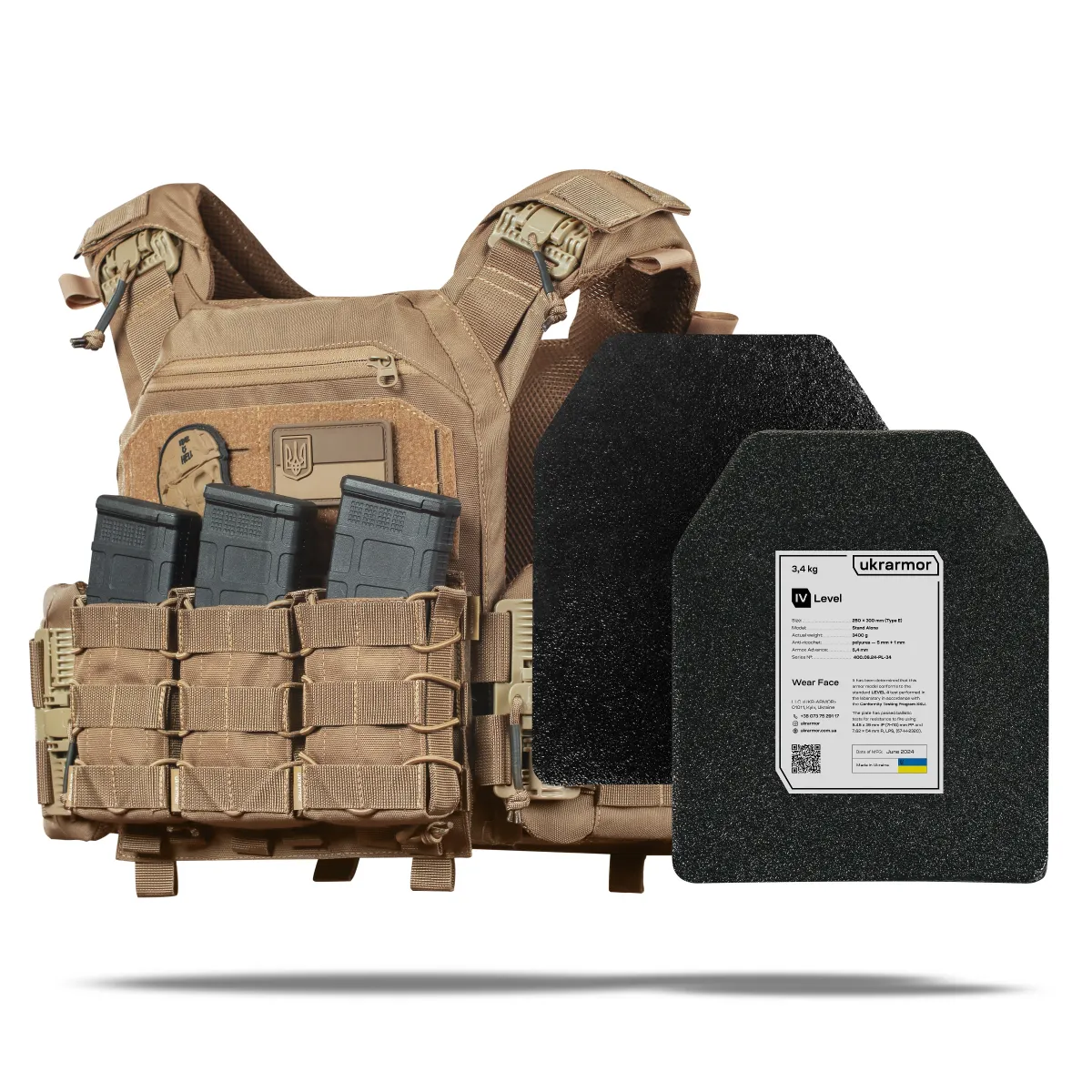 - Комплектация 2 бронеплиты (материал сталь Armox Advance + полимерный антирикошет), плитоноска улучшенная (PRO), копия протокола отстрела