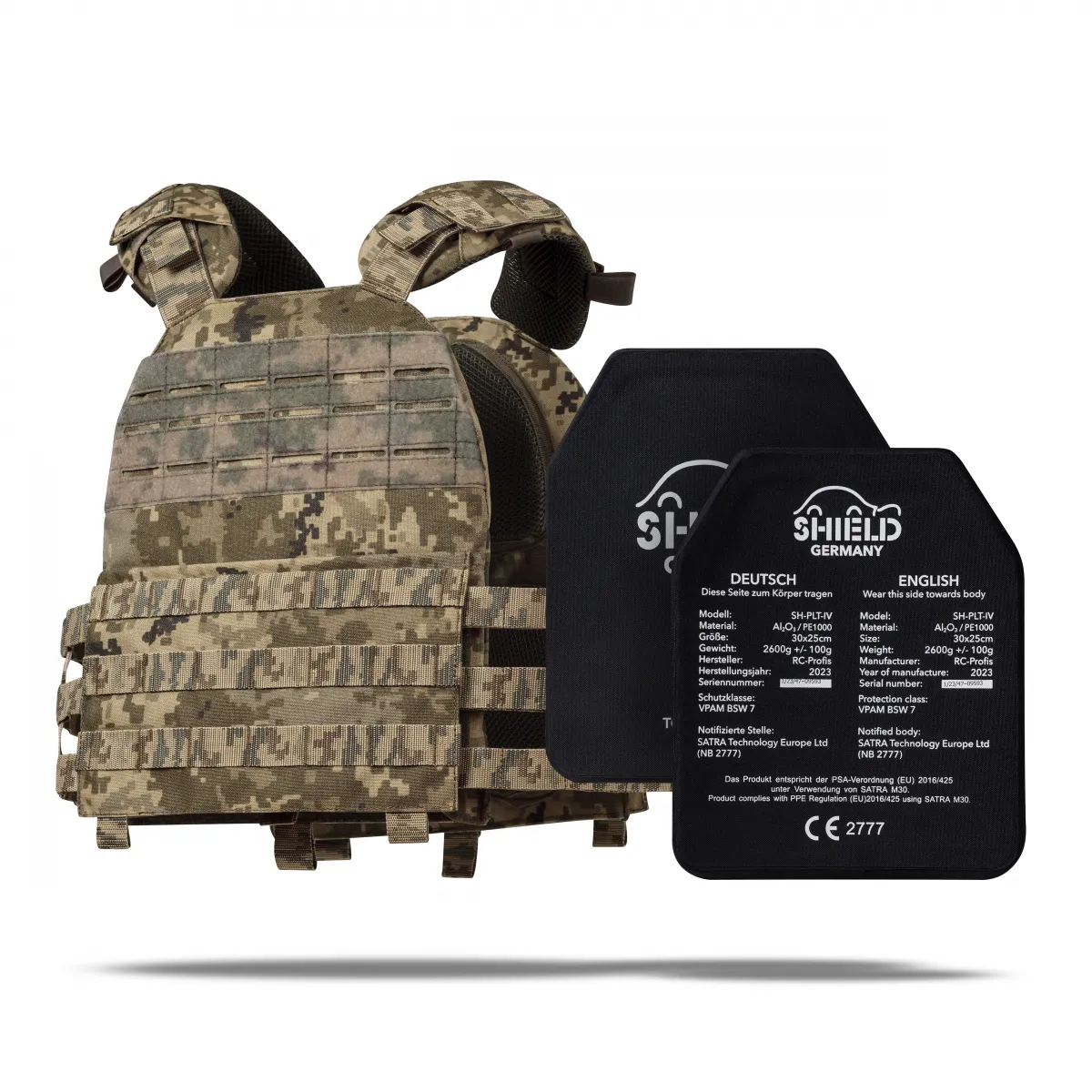 - 2 бронеплиты 6-го класса Shield Germany® SK4 (вес 2.65 кг, материал керамика алюминий оксид Al₂O₃);