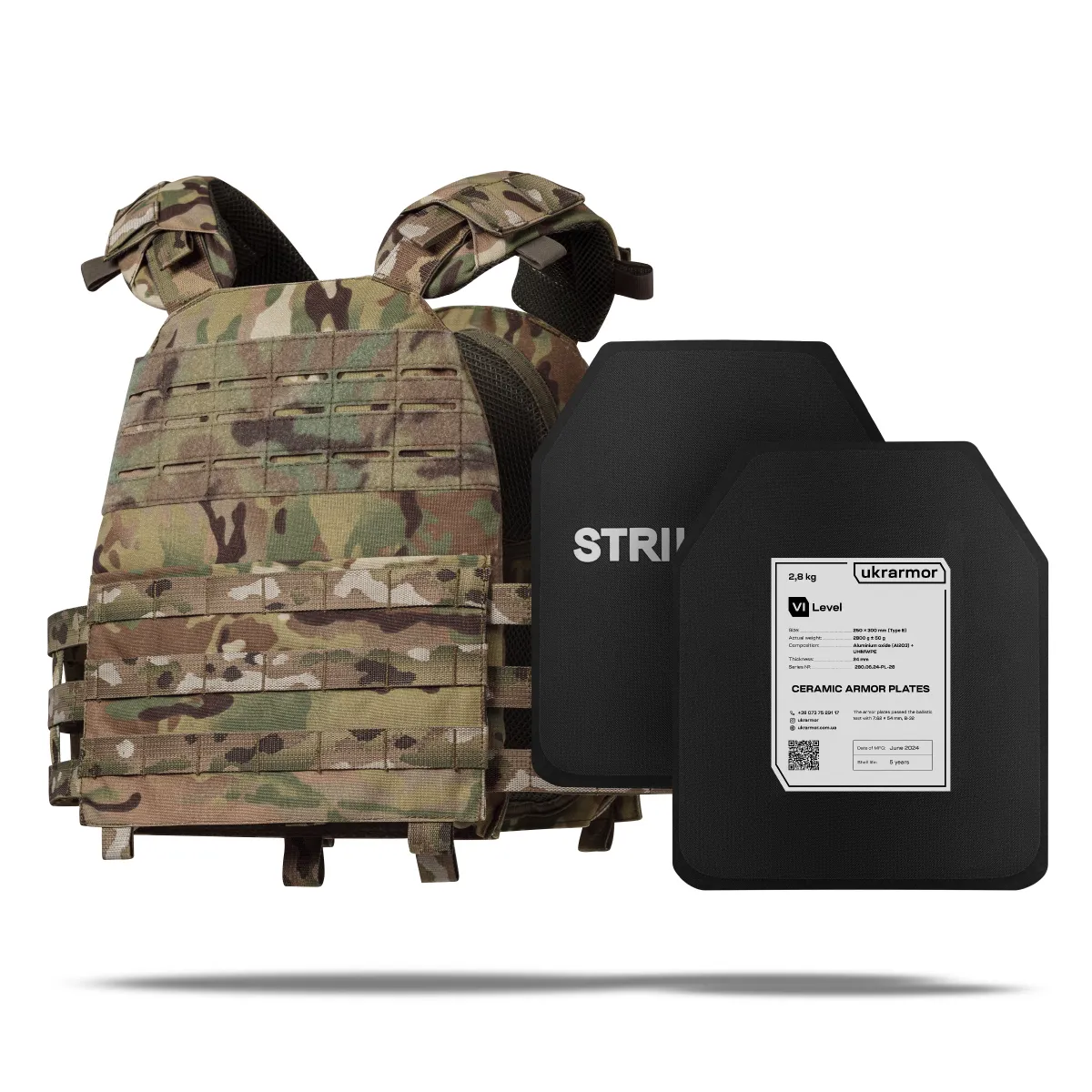 - Комплектация 2 бронеплиты 6-го класса (вес 2.8 кг, материал керамика Алюминий Оксид Al₂O₃), плитоноска M.V.P