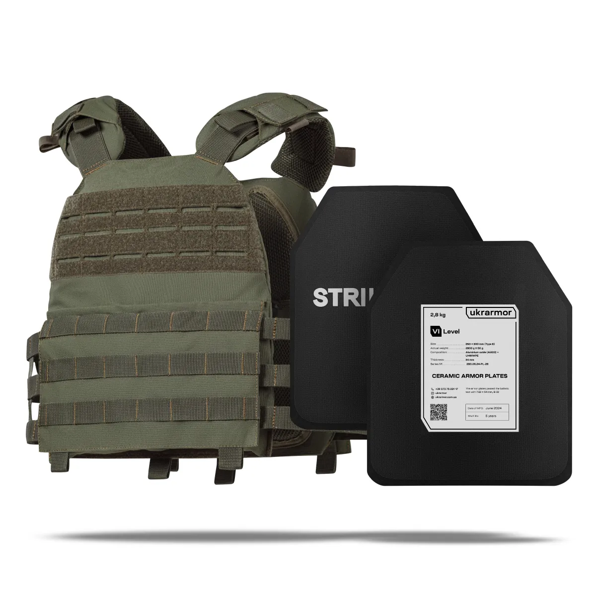 - Комплектация 2 бронеплиты 6-го класса (вес 2.8 кг, материал керамика Алюминий Оксид Al₂O₃), плитоноска M.V.P