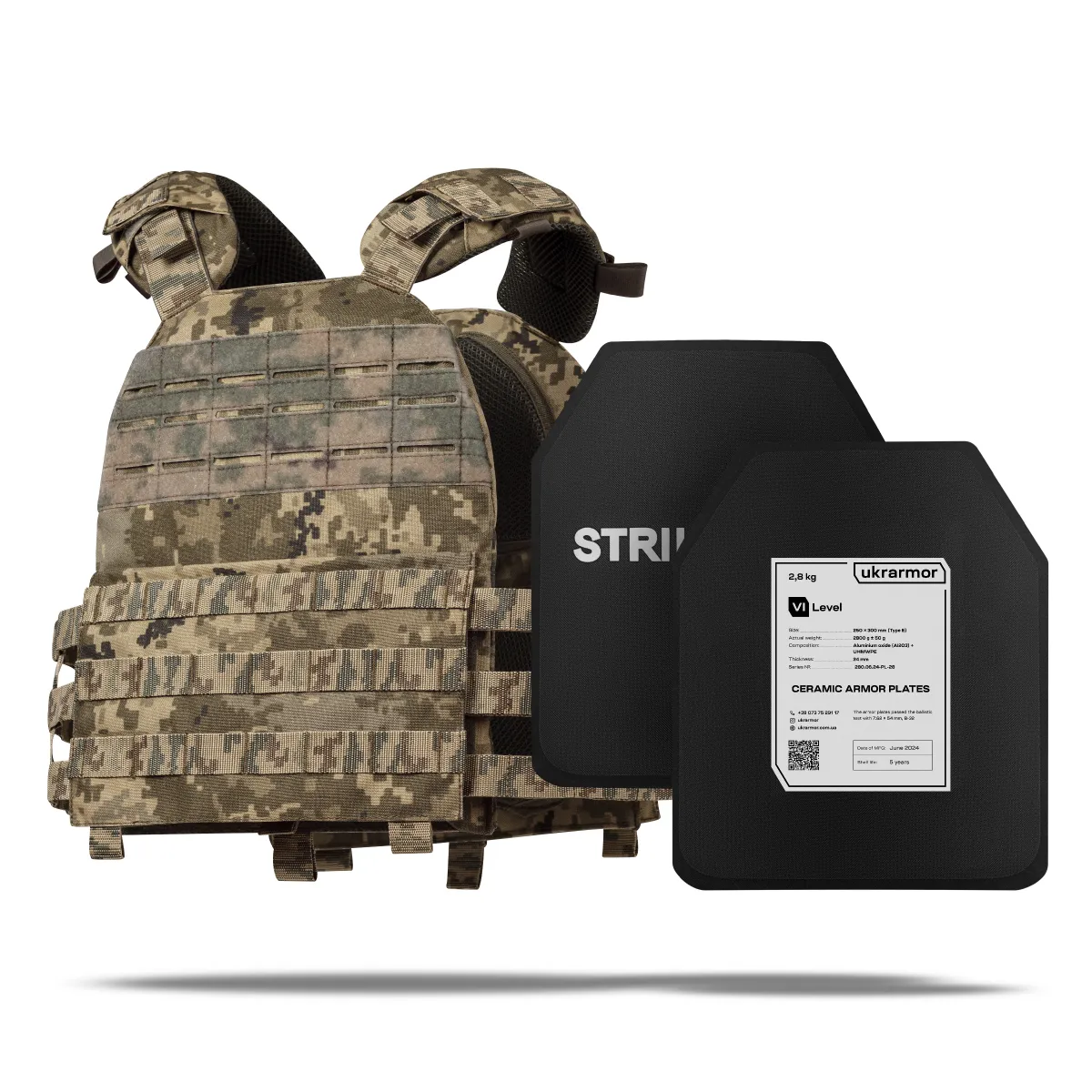 - Комплектация 2 бронеплиты 6-го класса (вес 2.8 кг, материал керамика Алюминий Оксид Al₂O₃), плитоноска M.V.P