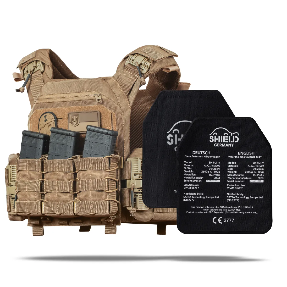 - 2 бронеплиты 6-го класса Shield Germany® SK4 (вес 2.65 кг, материал керамика алюминий оксид Al₂O₃);