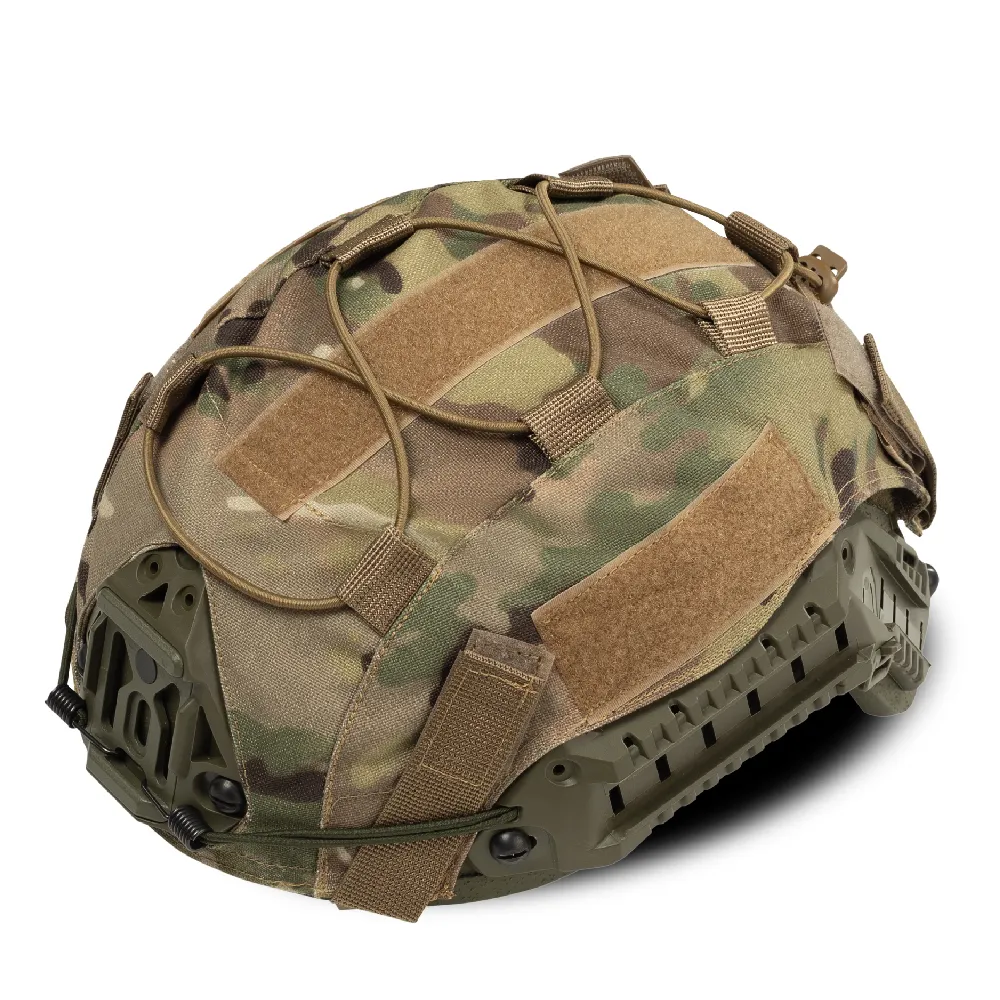 Кавер можно легко прикрепить к шлему с помощью велкро-панелей (липучек), которые расположены по бокам, сзади и сверху. Эти панели предназначены для крепления идентификаторов, маячков и шевронов. На чехле есть специальные стяжки, позволяющие удобно закрепить шнуры или дополнительный камуфляж.