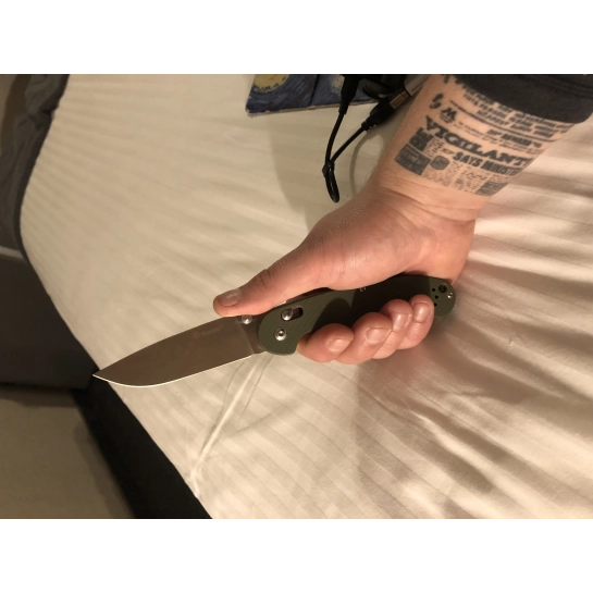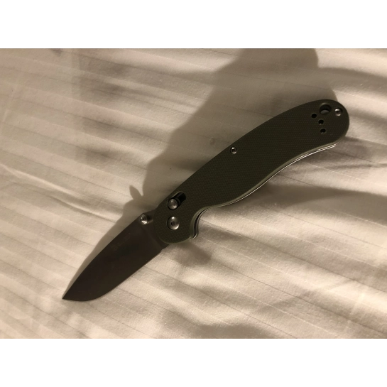 Карманный нож, который вполне безопасно переносить и удобно использовать. Лезвие ножа сделано из нержавеющей стали марки 440С, которая помимо высокой сопротивляемости коррозии отличается еще и достаточно большой жесткостью (около 58 единиц Роквелла).