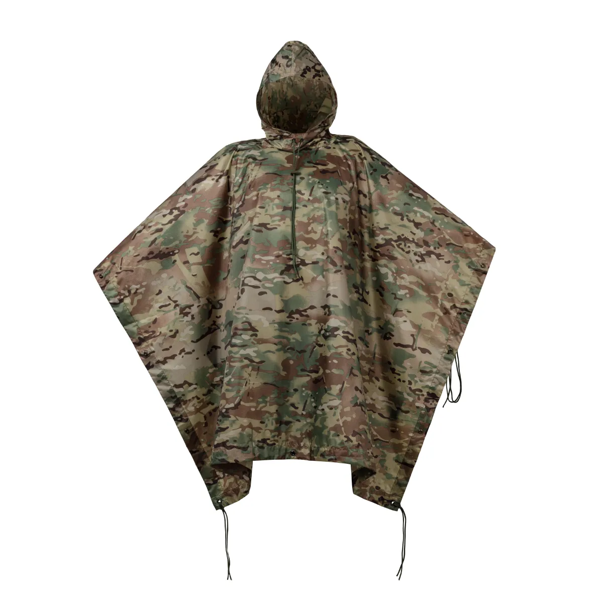 Легкое и влагостойкое защитное пончо, изготовленное по спецификации военно-полевой одежды армии США. Функциональный элемент снаряжения можно использовать как защиту от ветра, дождя, а благодаря универсальной форме пошива его можно одевать даже поверх зимней одежды или баула с вещами, также может применяться как небольшая палатка.