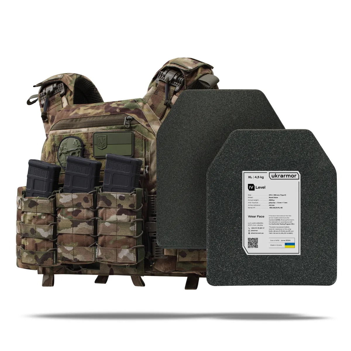 - Комплектация Плитоноска PRO и две бронеплити 4-го класса защиты размера XL (27 х 35 см)