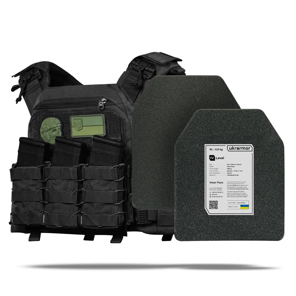 - Комплектация Плитоноска PRO и две бронеплити 4-го класса защиты размера XL (27 х 35 см)